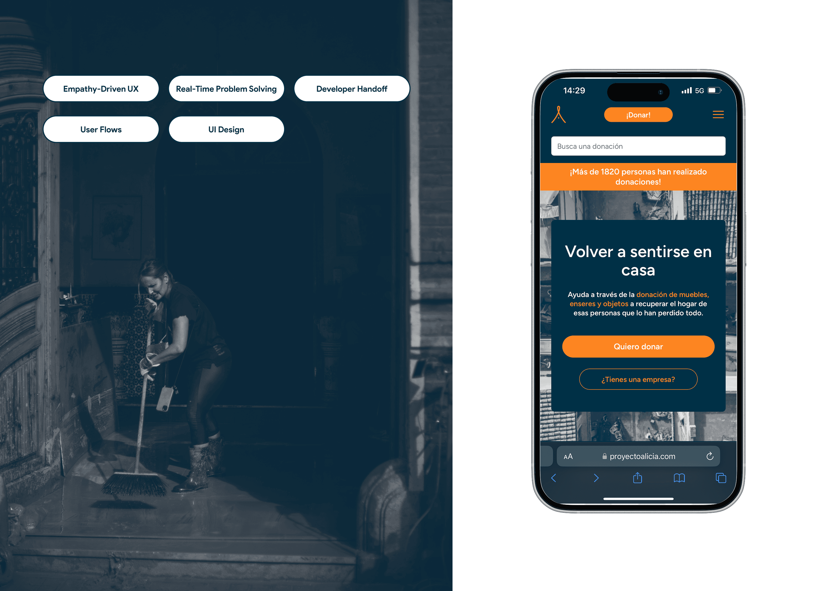 Social impact web app, created in response to the Dana floods, in Valencia, Spain. Connecting donors with people in need. Focused on simplifying the donation process and building trust through transparency.
