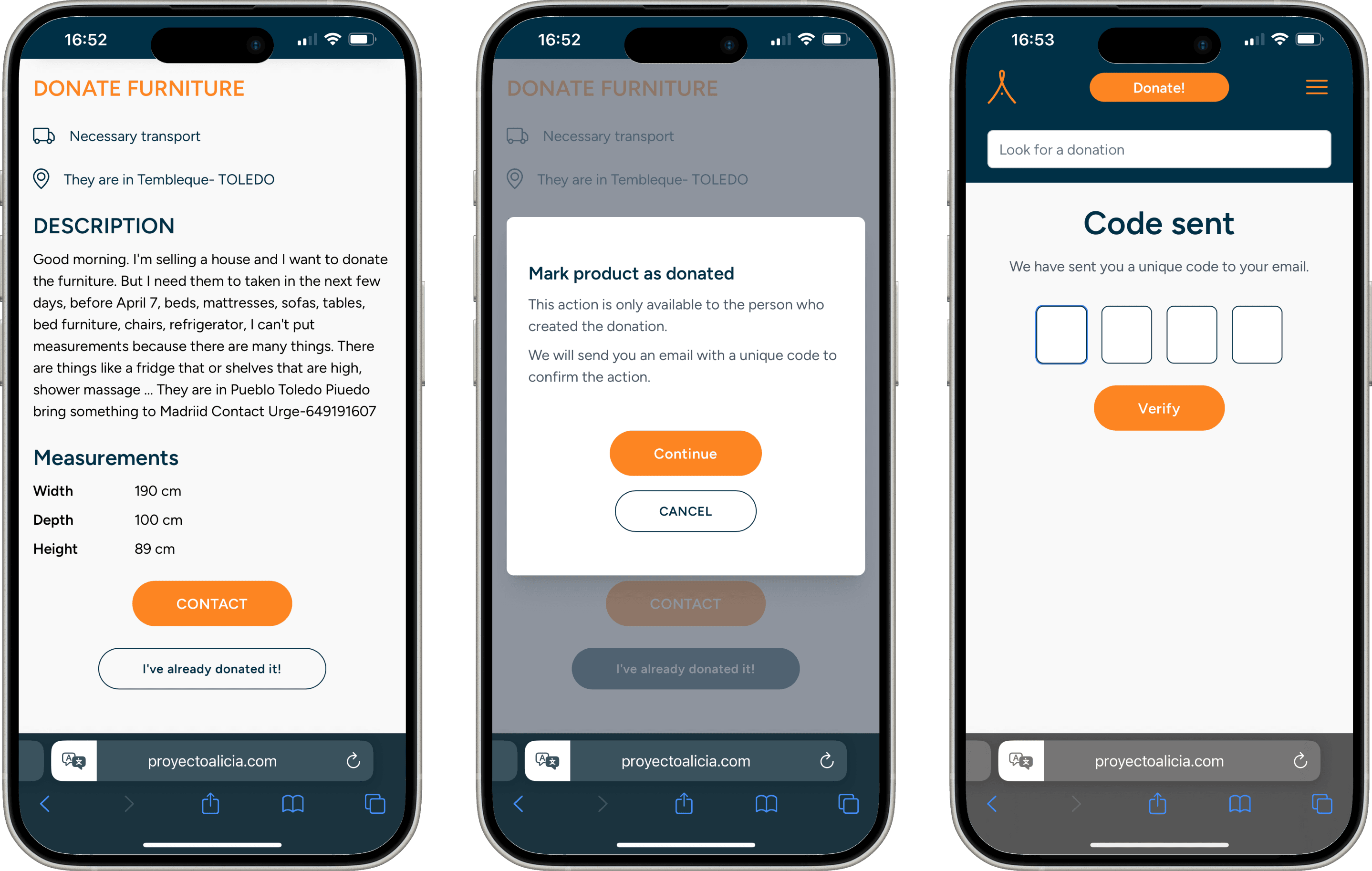 We added a “Mark as Donated” button. Donors received a unique code by email, which they could enter to automatically remove the item, no login required. Simple, secure, and user-friendly.